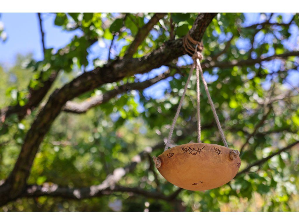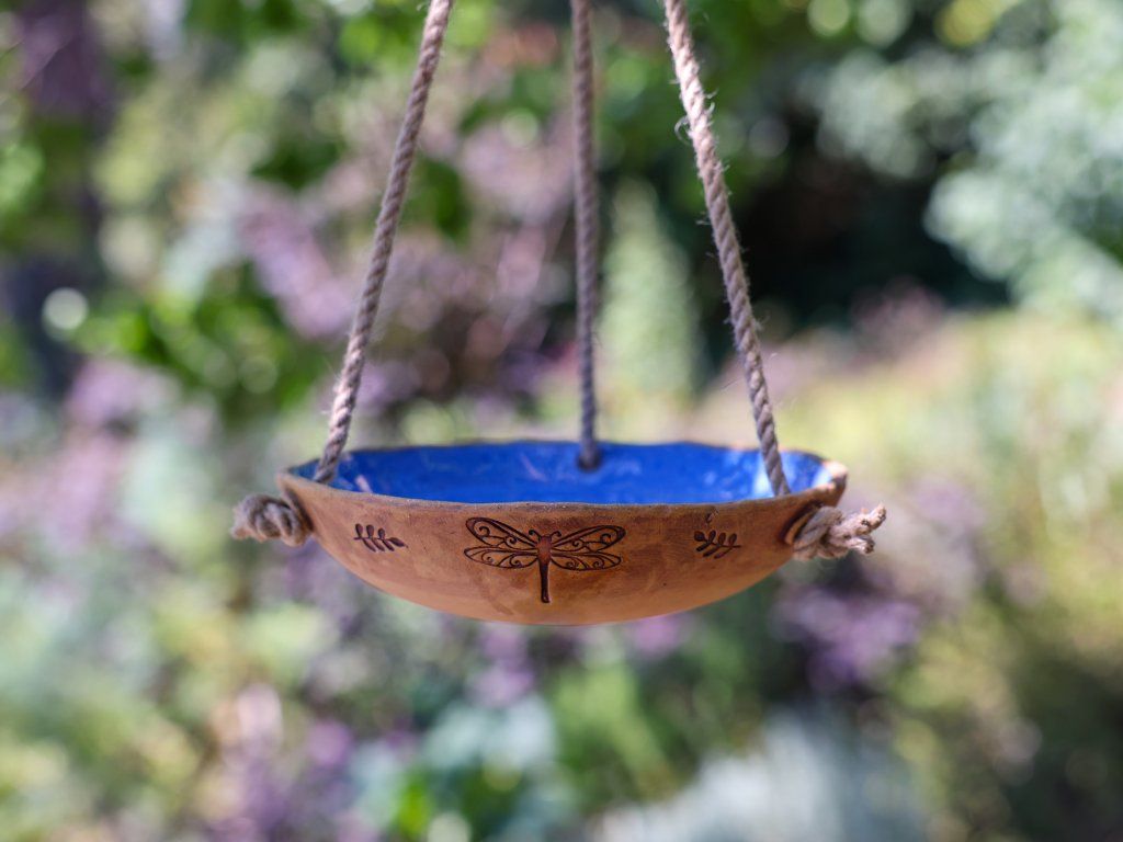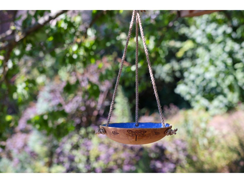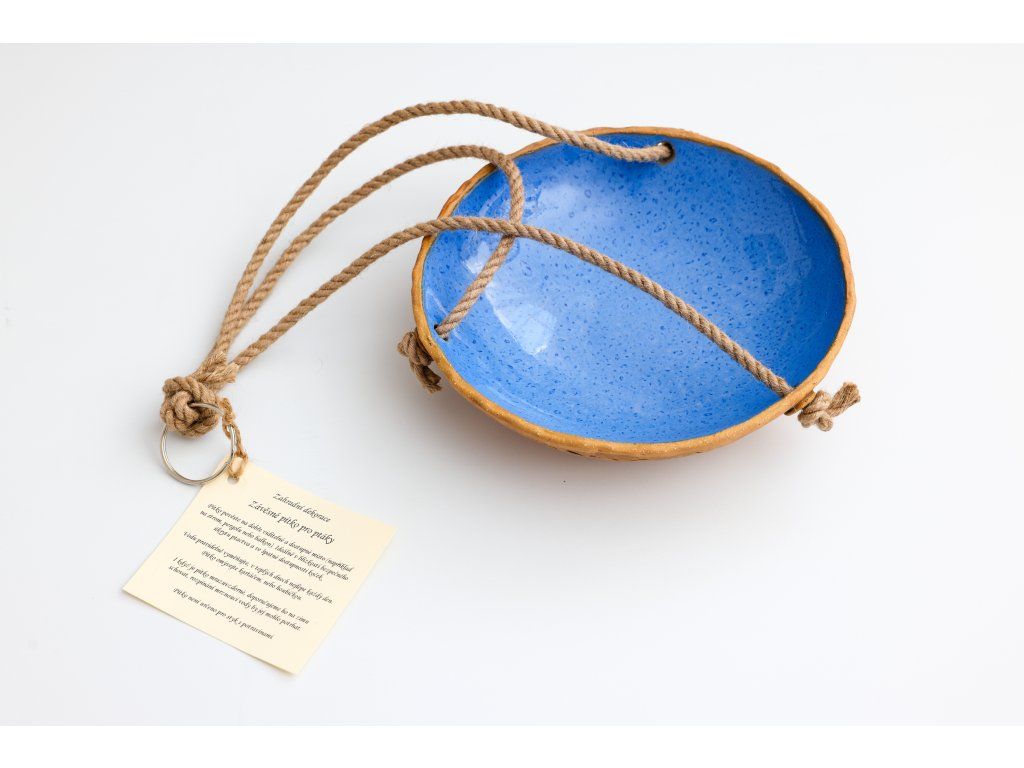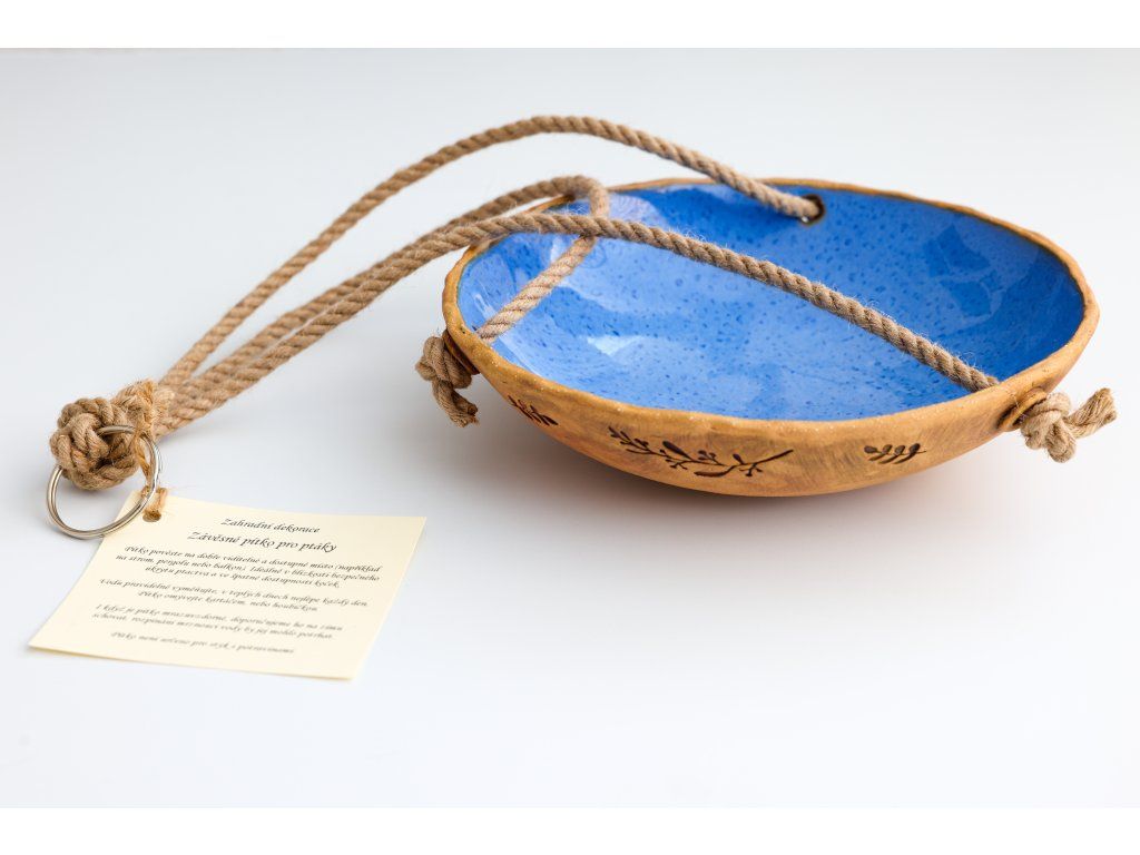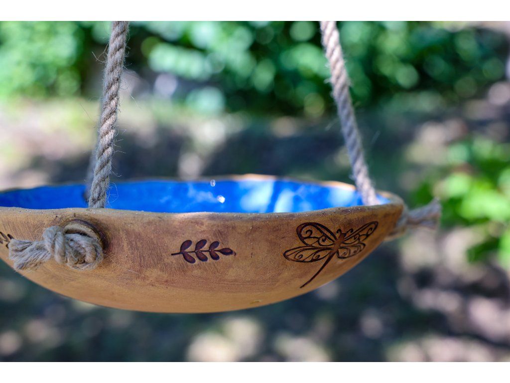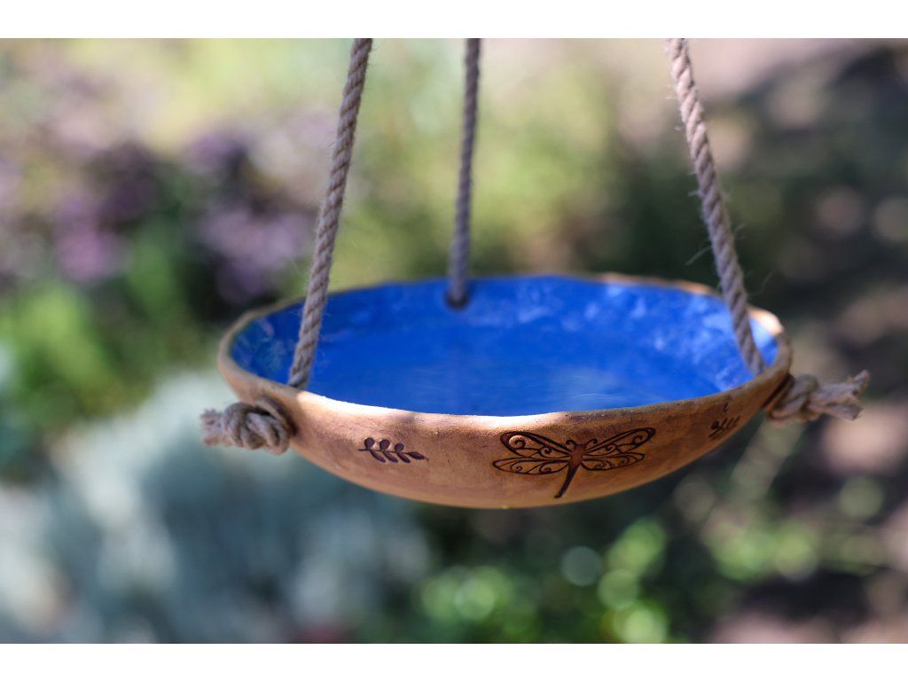 Keramické pítko pro ptáčky se sytě modrou glazurou a motivem vážky a rostlin z dílny paní Soni Klapetkové. Pítko je možné zavěsit pomocí přiloženého provazového závěsu třeba na strom. Stane se půvabnou dekorací vaší zahrádky a ptákům poslouží v horkých letních dnech k příjemnému osvěžení.