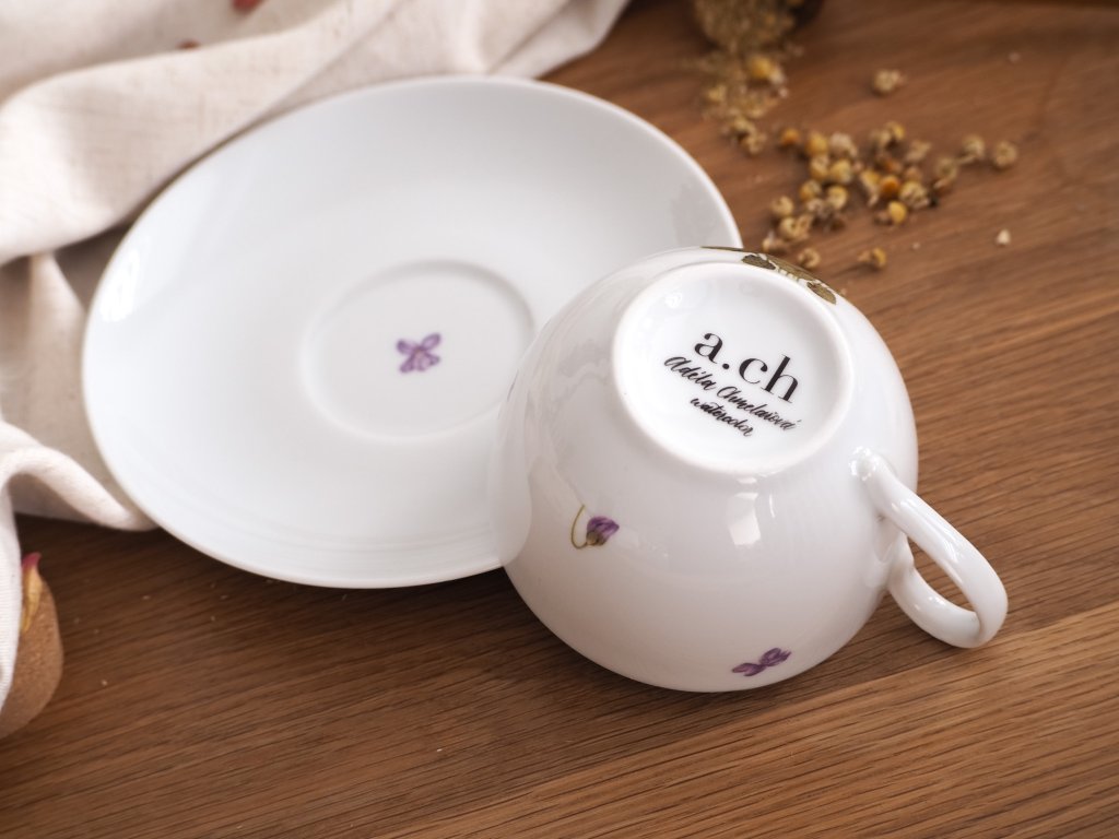 Porcelánový šálek s jemnými autorskými ilustracemi violek od botanické ilustrátorky Adély Just Chmelařové – tvořící pod značkou a.ch watercolor – je ideální volbou pro všechny milovníky přírody a originálního designu.