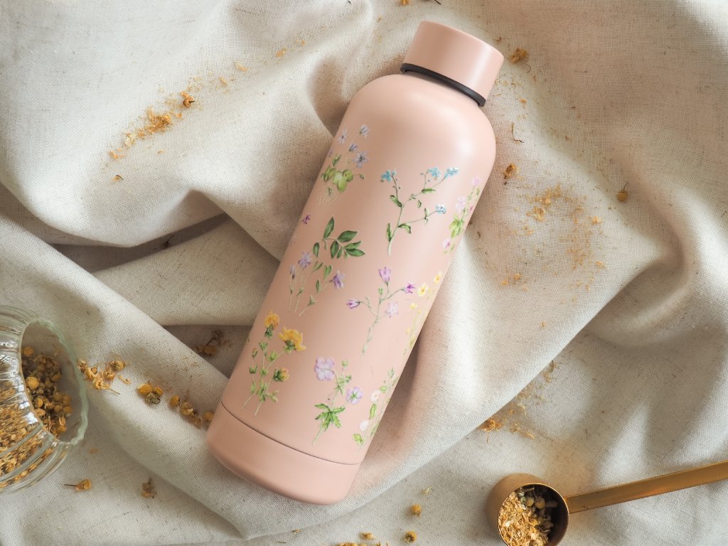 Díky dvoustěnné izolaci udrží nápoj horký nebo studený po delší dobu. Růžový matný povrch je doplněný o květinové ilustrace, které jsou lesklé, lehce vystouplé a odolné proti poškrábání díky UV laku – ideální na každodenní používání.